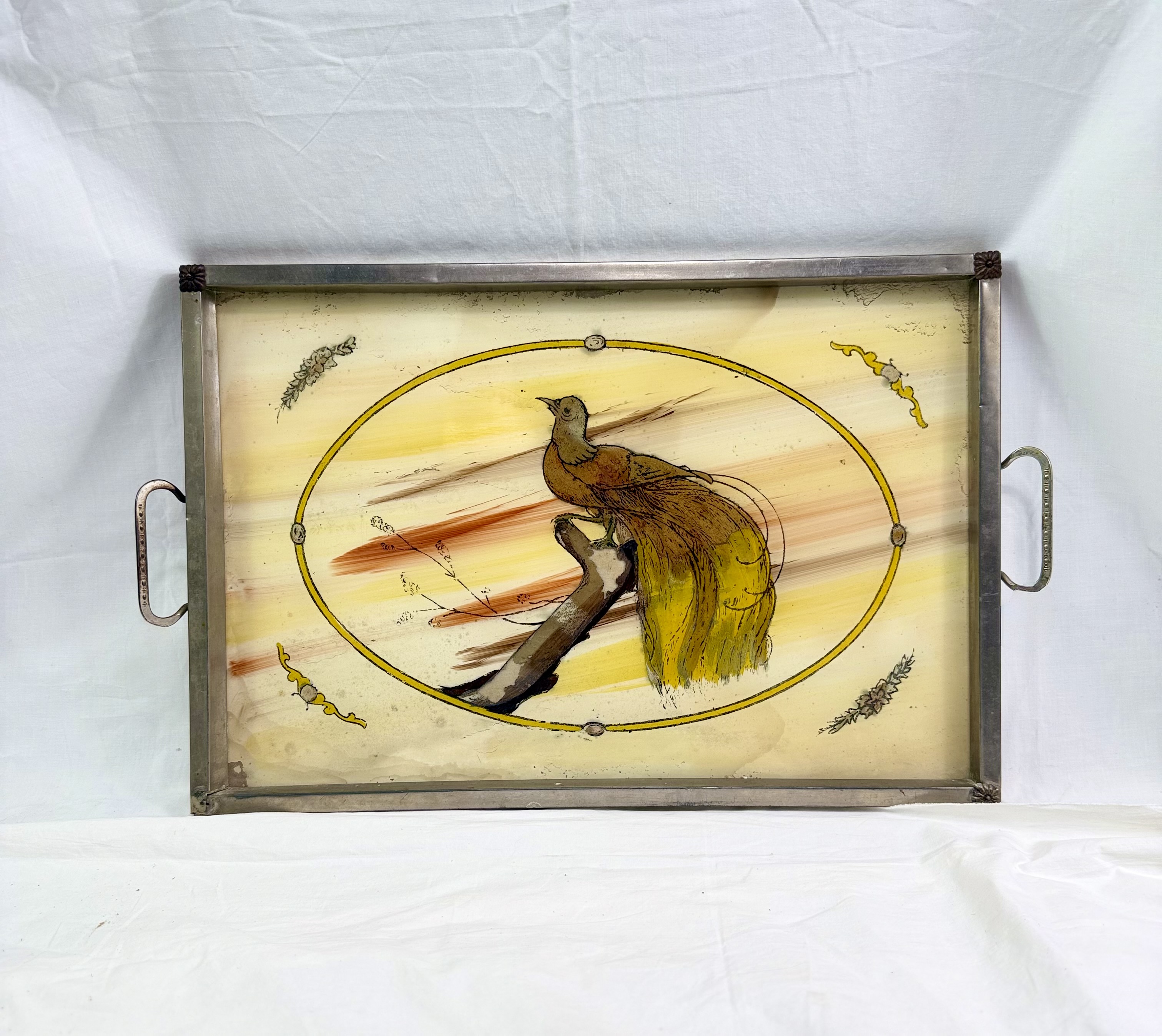 Art Deco Reverse Painted Glass Tray with Orange Background