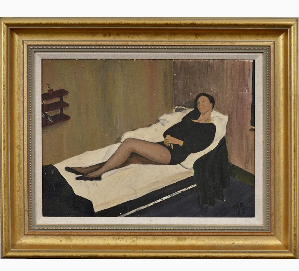 A Modern British School Painting from 1967, signed with initials E.K. or F.K. . The painting depicts a partially dressed woman reclining on a chaise. Framed in a gold painting from the era.