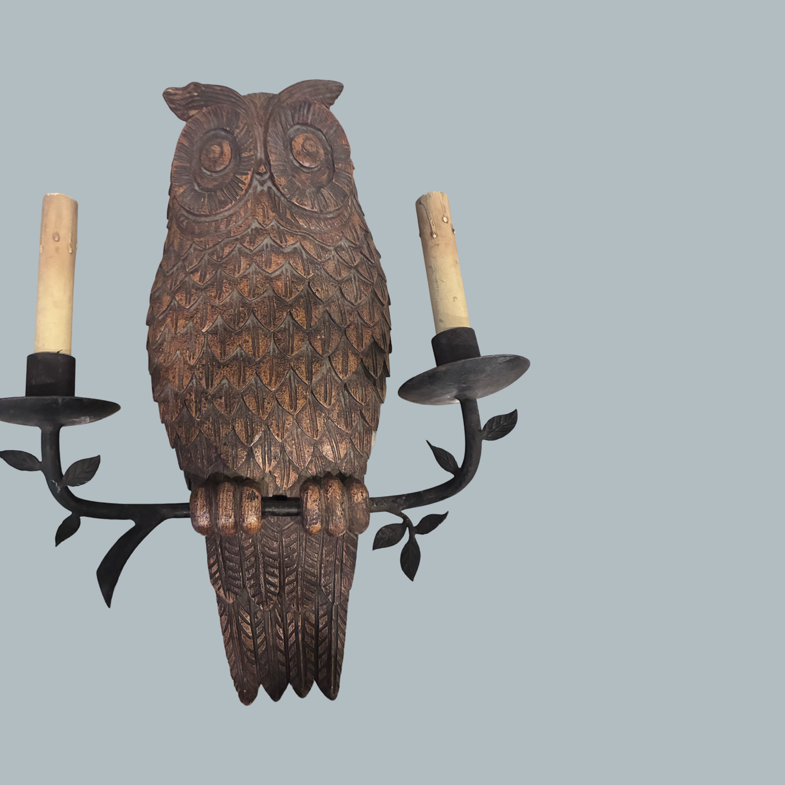 Rare hand carved Wooden Owl sconce with two electric sconces on either side.