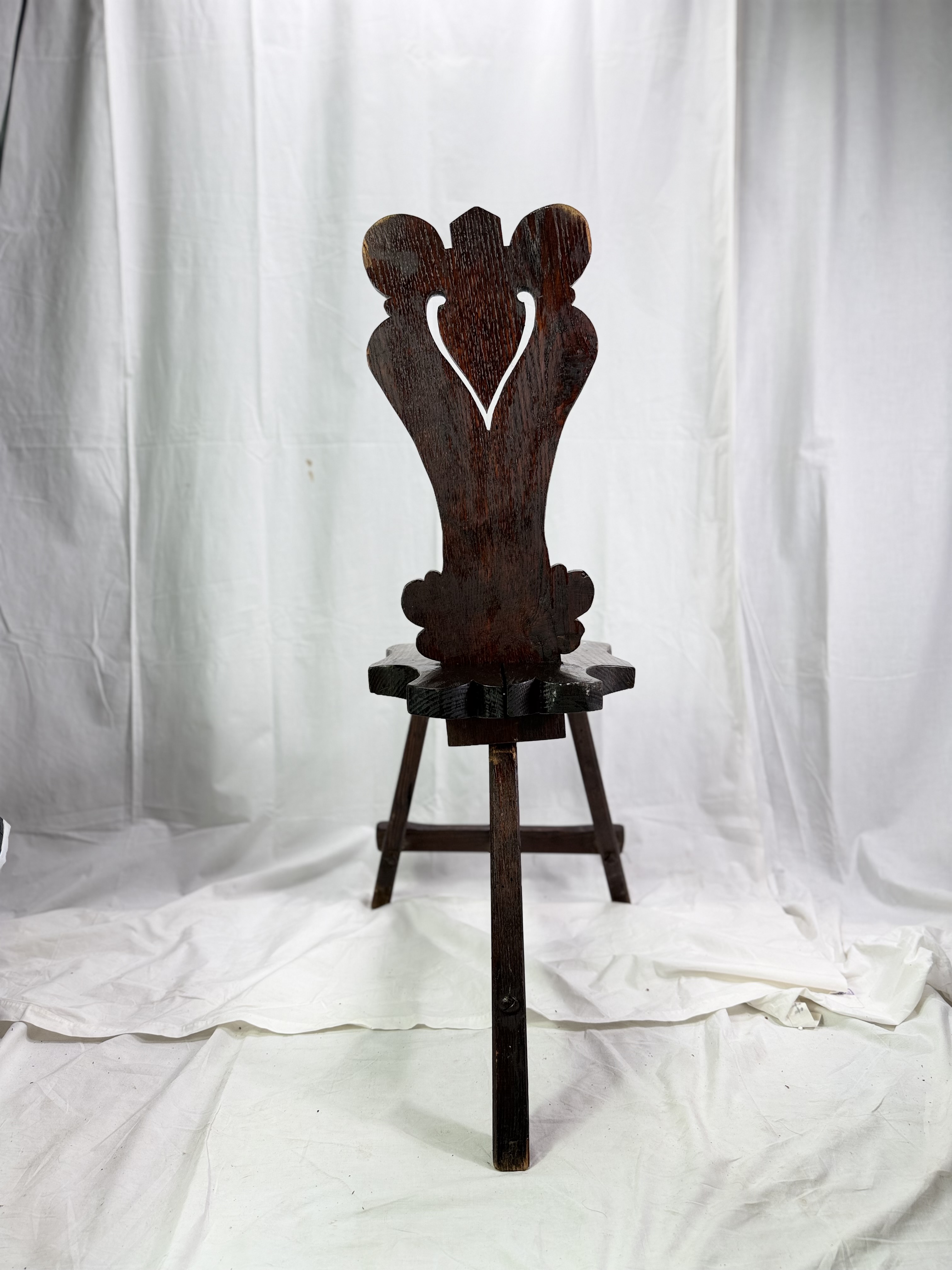 This exquisite hand carved chair is from the Alpine Regions of Italy and commonly used as spinning chairs because of the small size and three legged structure.