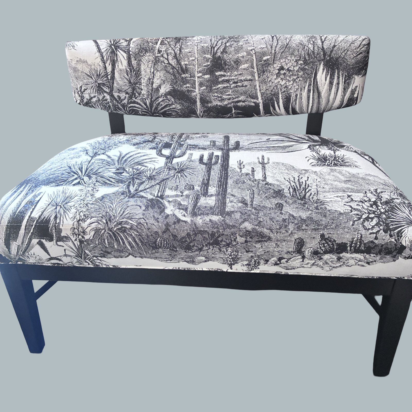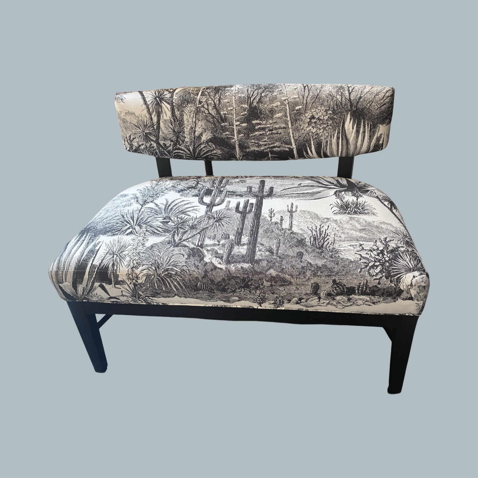 Stunning Mid Century Modern Bench/settee with matte black finish and elegant Pierre Frey fabric "Pampa Noir". Ideal for end of the bed or a window bench.
