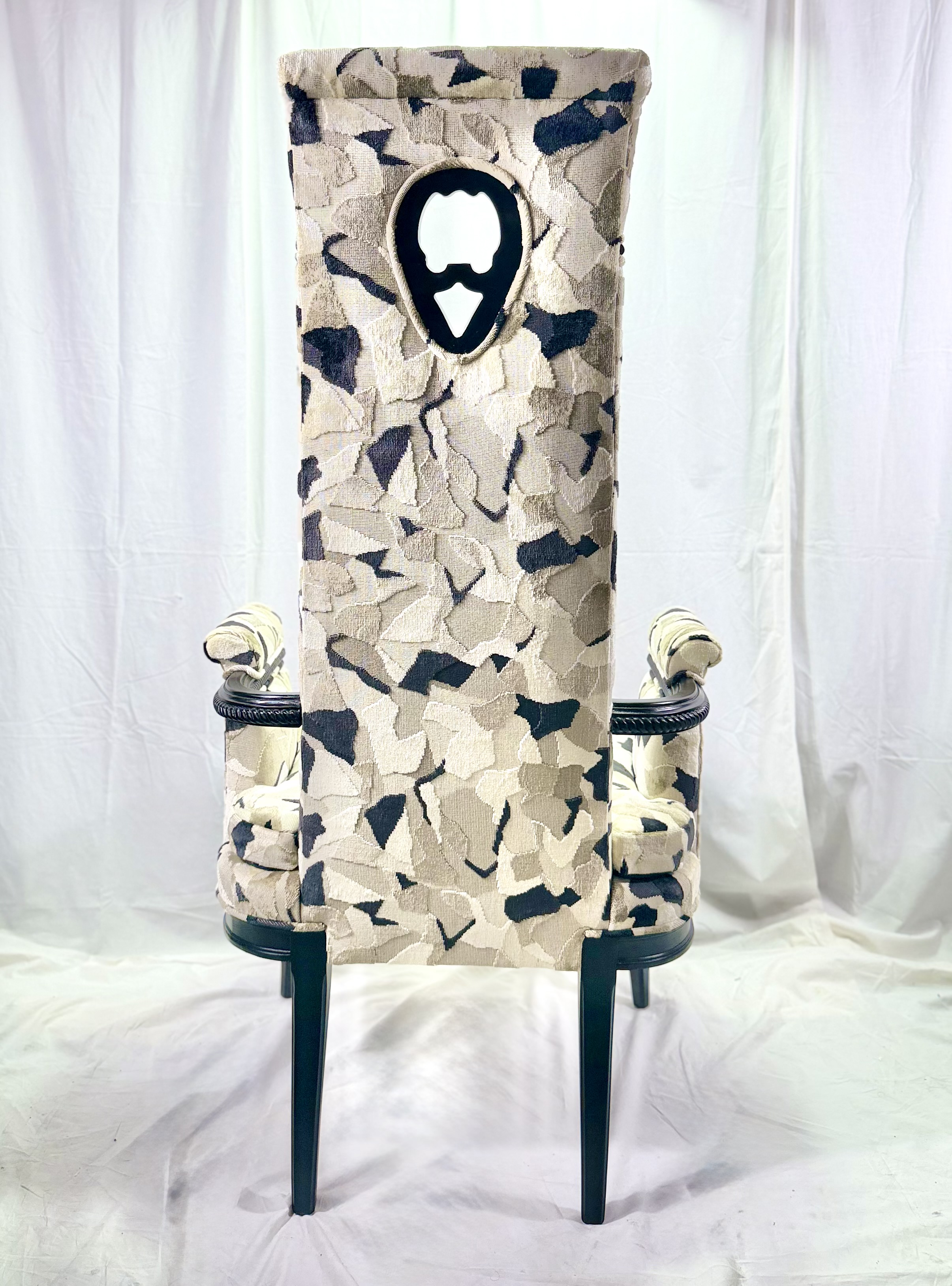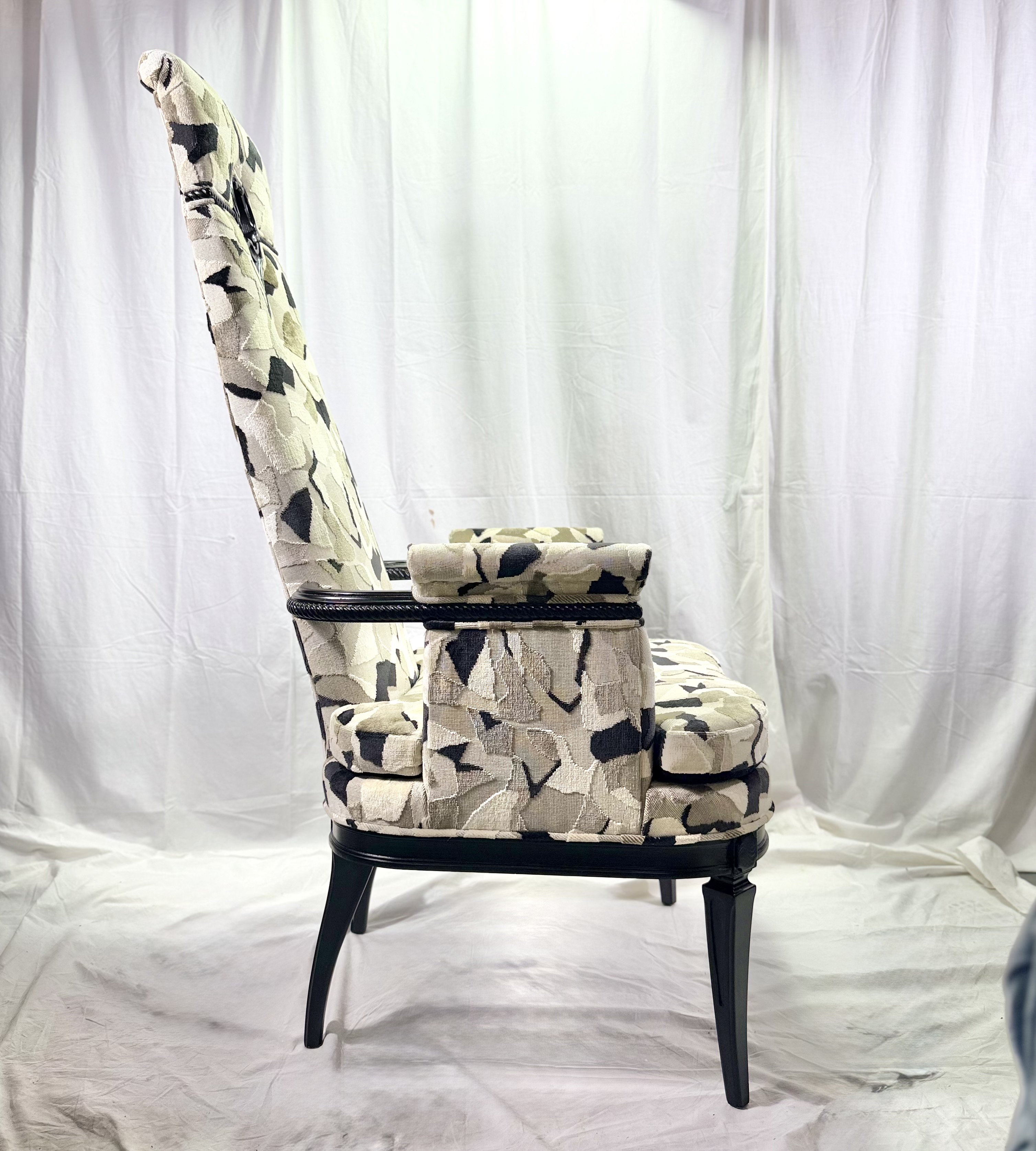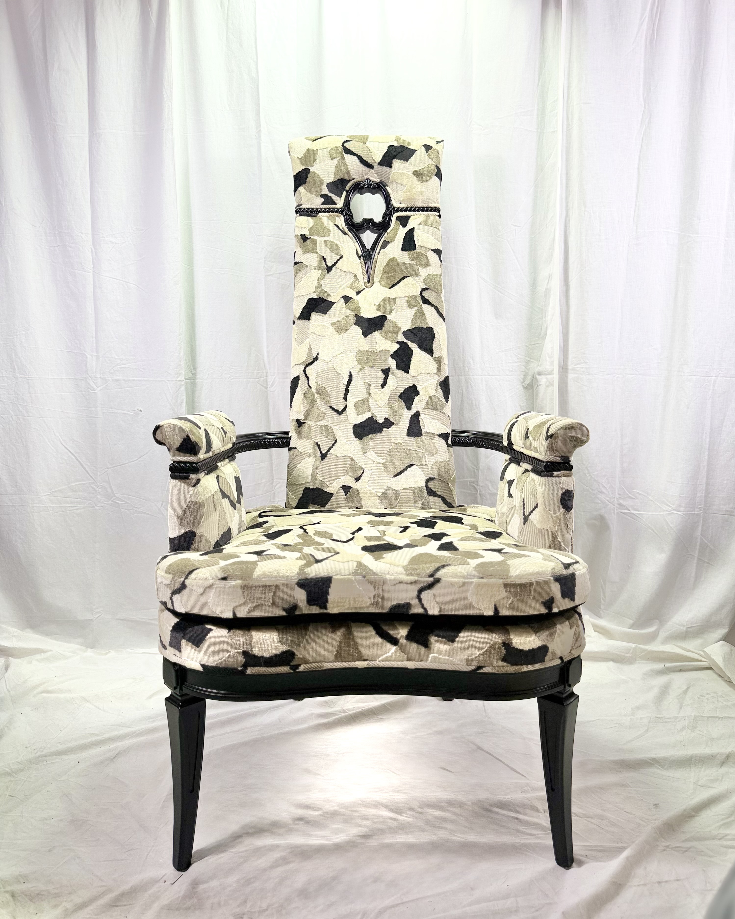 The high back chairs have a black lacquer finish and have recently been recovered in a luxurious velvet fabric by British company Kirby Design. Pattern is Hidden and color way is Monochrome.